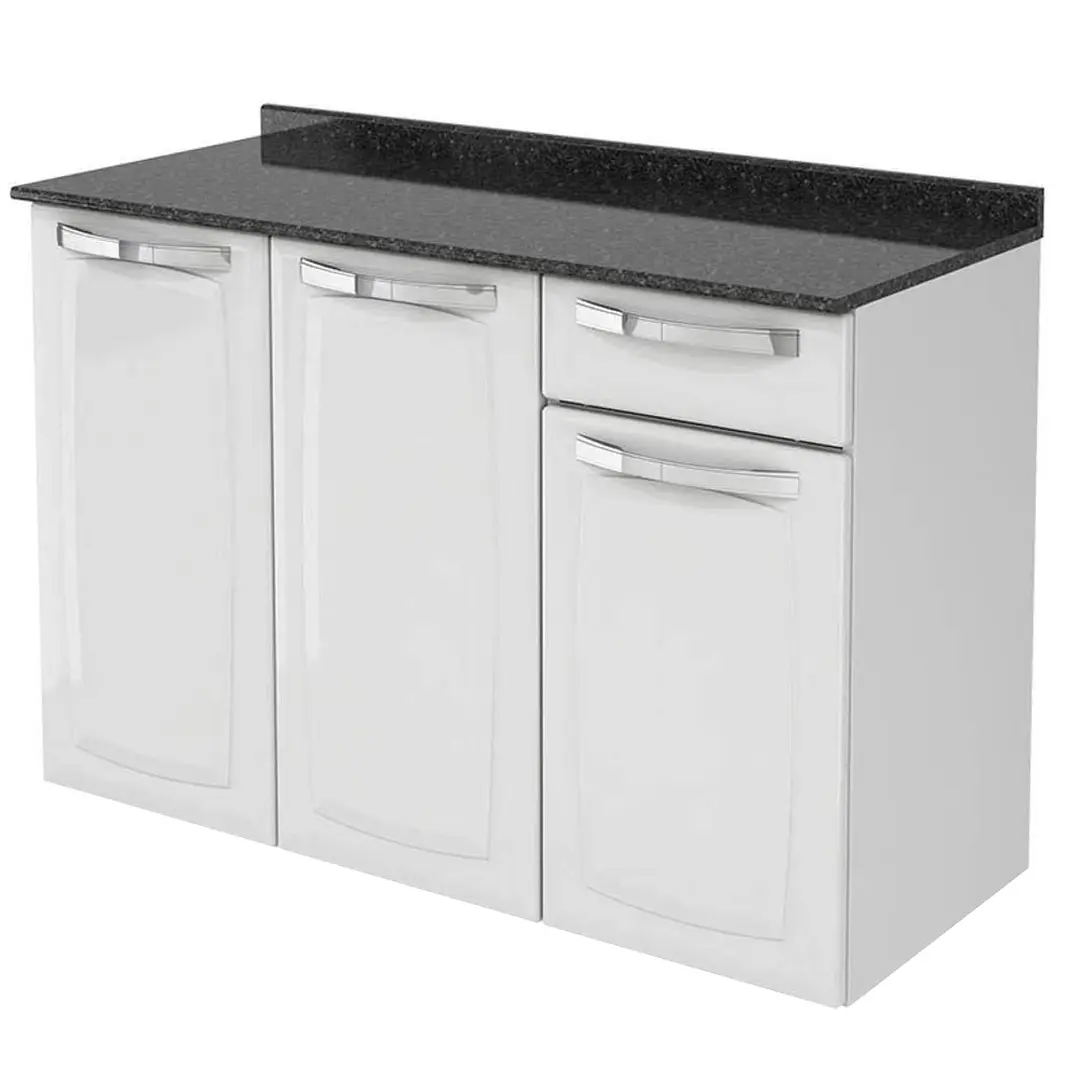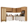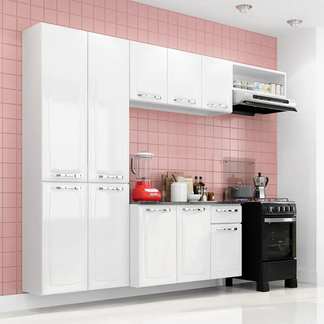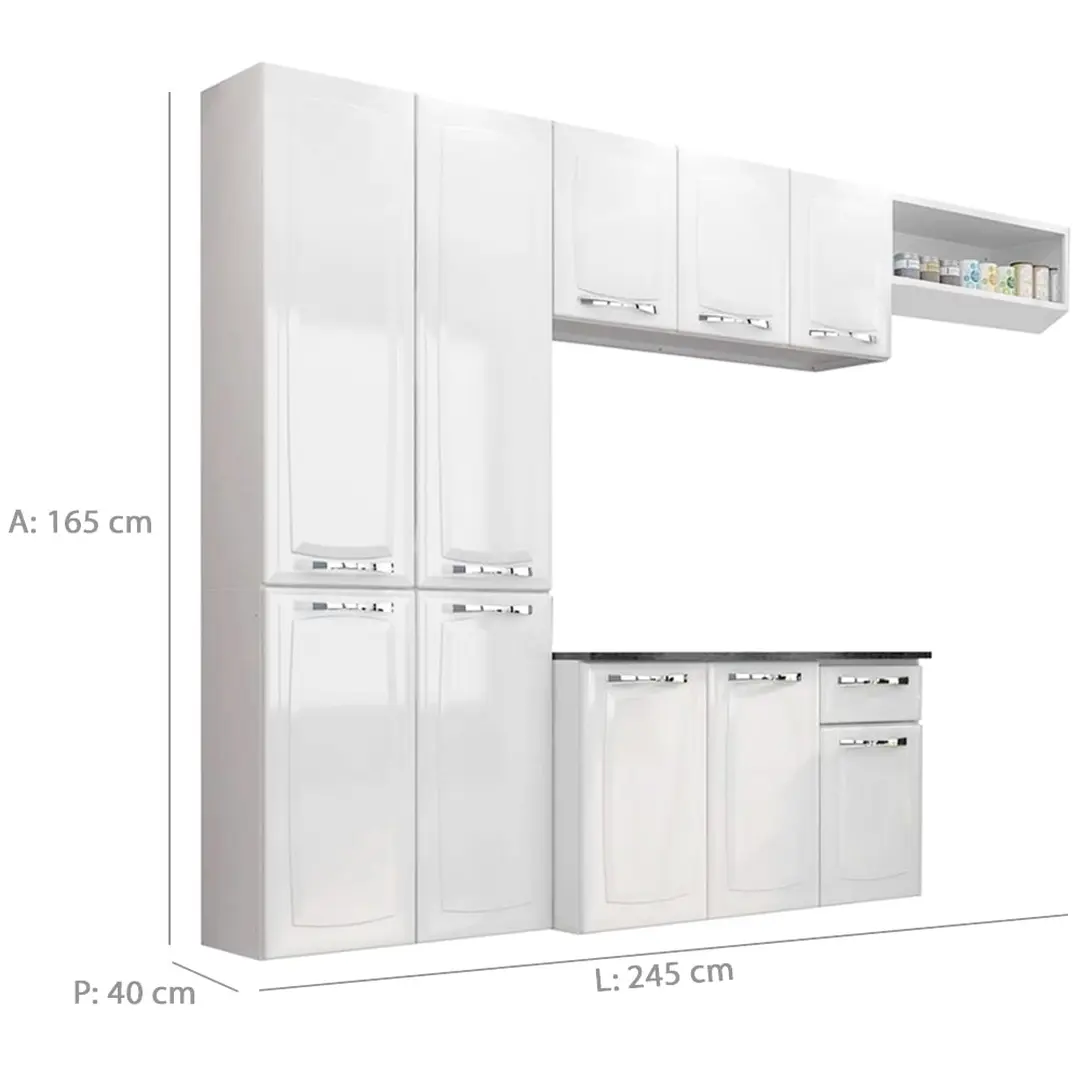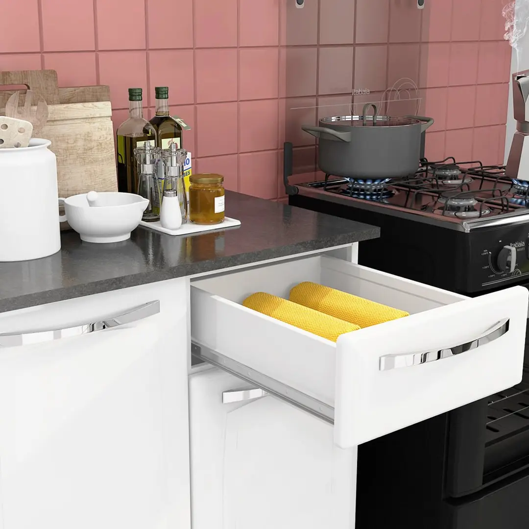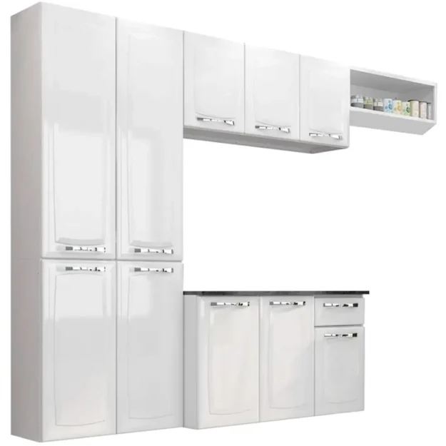 Possui módulos com prateleiras bem divididas, 10 portas, 1 gaveta e 1 nicho aéreo, facilitando muito mais na organizar da cozinha. Seus puxadores são metalizados, fáceis de manuseio e resistentes. Além de gaveta profunda, que possuem corrediças telescópicas, para um abrir mais suave.