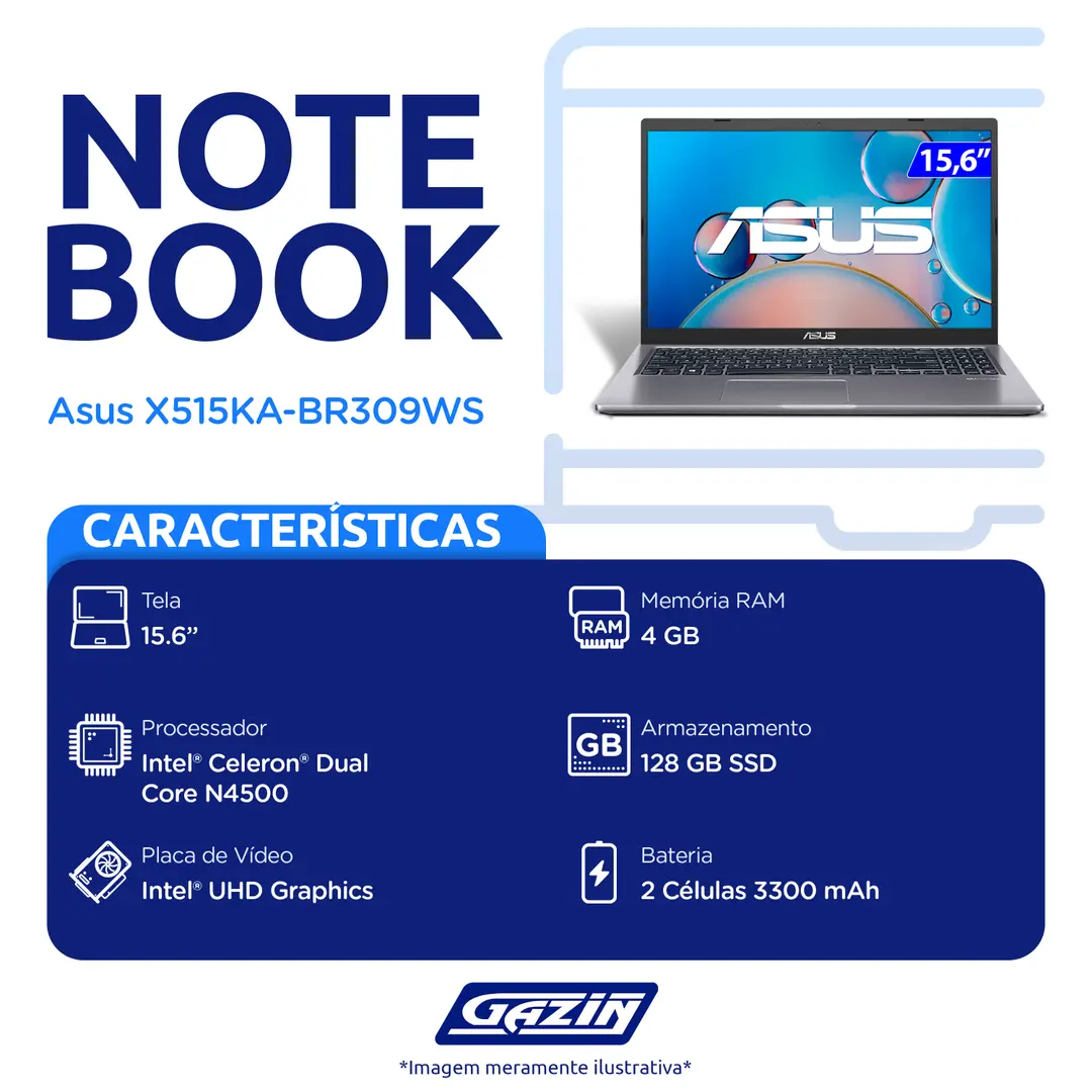 Se você busca um notebook confiável, leve e eficiente para acompanhar sua rotina, o Asus X515KA-BR309WS é a escolha perfeita! Com um design moderno e tecnologia de ponta, ele oferece o equilíbrio ideal entre desempenho e praticidade, atendendo às necessidades de estudantes, profissionais e usuários que desejam um equipamento mais rápido e responsivo. Confira mais detalhes: